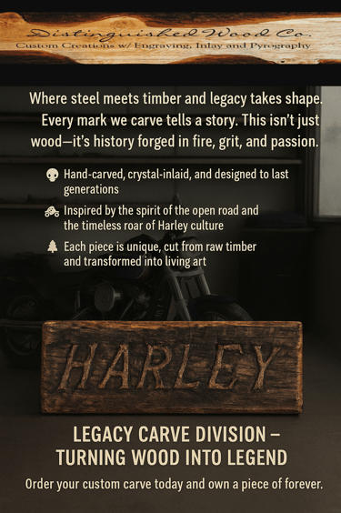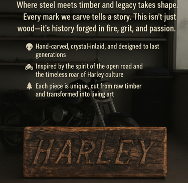 Legacy Wood Carve specializes in quality works renowned for its motorcycle and biker-themed carvings—including Harley-Davidson, classic bike silhouettes, and road-inspired motifs—often enhanced with hand-set crystal inlays for a striking, high-impact finish. Every creation tells a story, carrying the warmth, texture, and timeless beauty of natural wood into homes and spaces where it will be cherished for decades.